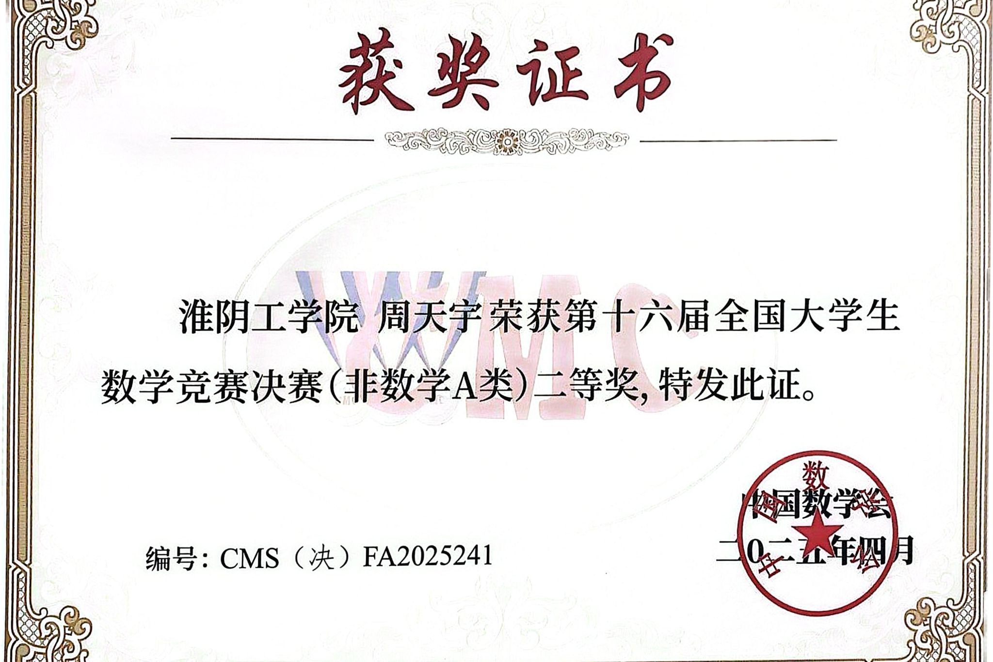 近日,第十六届全国大学生数学竞赛决赛成绩揭晓。我校学生周天宇荣获非数学专业A类全国二等奖,为我校学子在该赛事中取得的最好成绩。