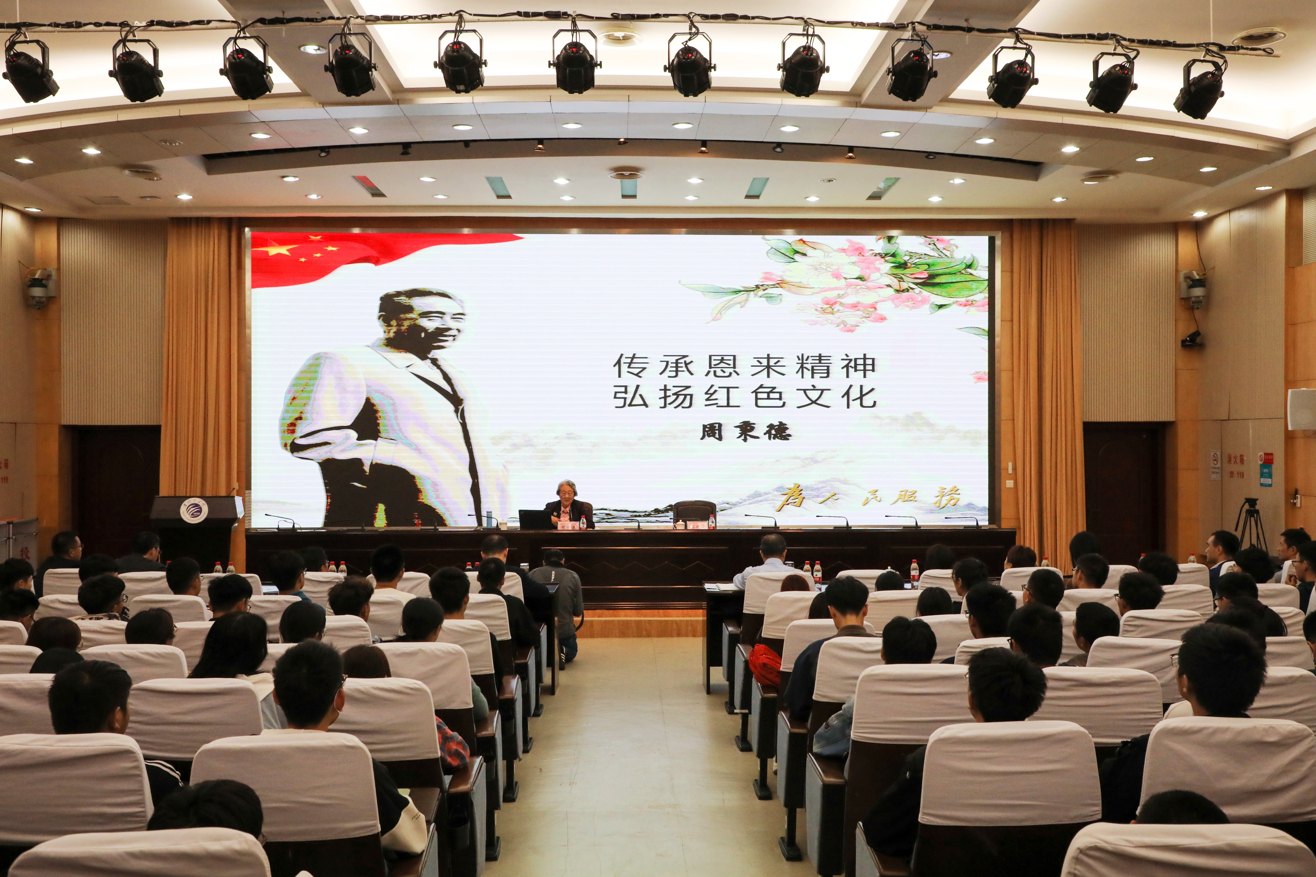 10月13日下午,北京大鸾翔宇慈善基金会创始会长,中国新闻社原副社长,全国政协委员,周恩来总理侄女周秉德先生来我校为学生做“传承恩来精神 弘扬红色文化”的专题讲座。校长孙爱武,党委副书记、副校长吴建华参加讲座。