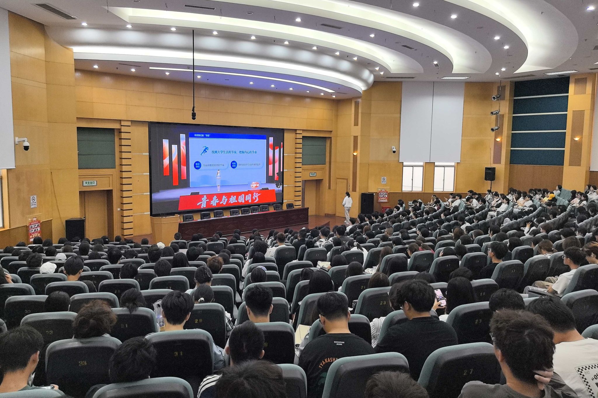 “开学第一课”以“青春与祖国同行”为主题,以一堂“思政大课”的形式,邀请13位高校师生代表,分别在“生逢其时”“青春有为”“强国有我”三个篇章,讲述他们与祖国同行的青春故事。东南大学青年首席教授张川分享了紫金山实验室青年科研团队一心一意做一事的奋斗历程;南京艺术学院单雯老师、江南大学黄晓丹教授带领同学们一起探寻藏在昆曲戏韵里、流淌在吴韵汉风中的文化根脉;苏州大学体育学院2025级新生、江苏省城市足球联赛苏州队球员陆子皓、赵文锦和陈开忠讲述他们在绿茵场上全力拼搏的故事;江苏省“最美高校辅导员”、河海大学姜帆老师带领大学新生寻找属于自己的“节奏”“理想”和“自信”;南京师范大学陈庆荣教授鼓励大学生在知识的探索中不断突破自我;中国青年五四奖章获得者、南京大学杜灵杰教授分享了在科研之路上聚焦国家需求的强国担当攻坚克难、砥砺奋进的故事;全国大学生基层就业人物、常州大学优秀毕业生易鉴政号召青年学子到祖国和人民最需要的地方挥洒青春热血;“梦想号”大洋钻探船副总建造师、江苏科技大学优秀毕业生伍常斌用“开拓创新、团结协作、攻坚克难、勇攀高峰”的“梦想号”精神和大家共勉;全国乡村振兴青年先锋、江苏农林职业技术学院优秀毕业生华梦丽用热爱和奋斗写下“新农人”“乡村振兴”的青春答卷;中国航空工业首席技术专家、南京航空航天大学杰出校友吴希明用深耕直升机领域40年的人生经历生动诠释“强国有我”的时代最强音。