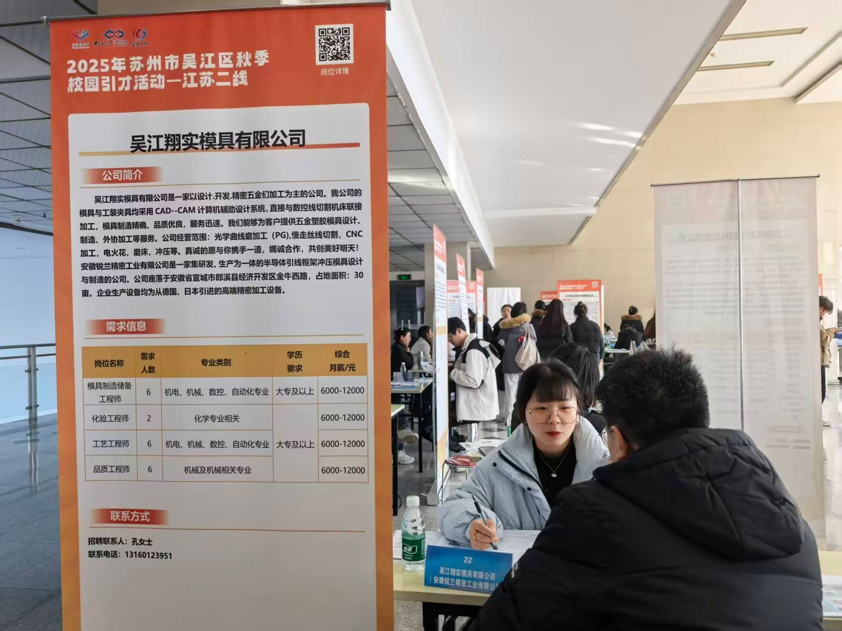 本次招聘会由我校招生就业处与吴江区人力资源和社会保障局共同举办,共邀请到江苏亨通电力电缆有限公司、江苏通鼎宽带有限公司、江苏朗雄储能科技有限公司、苏州盛虹纤维有限公司等30家企业前来招聘,招聘岗位涵盖机械、电气、自动化、材料、计算机、化学、市场营销等专业方向,总计提供近600个工作岗位。