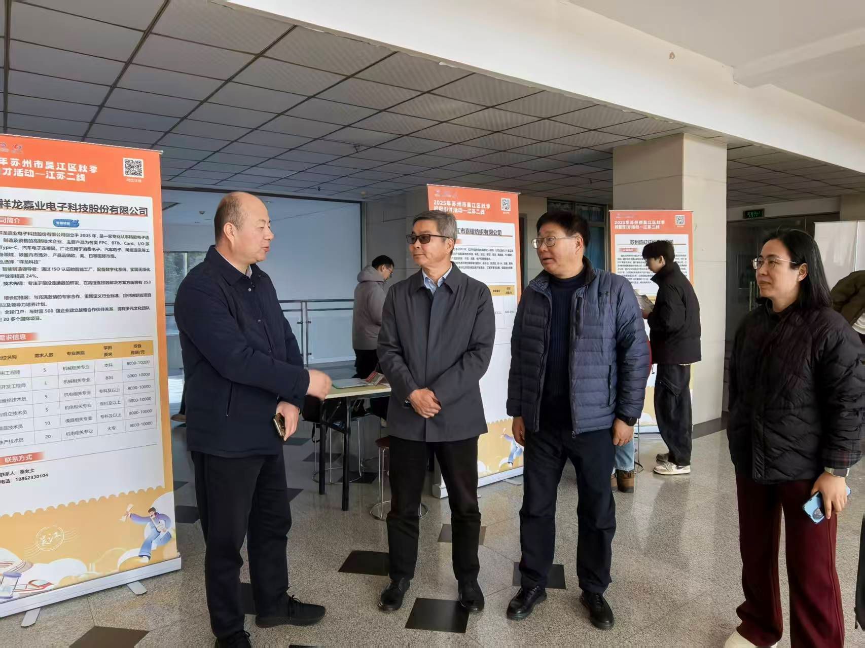秦家沛与吴江区人社部门负责人深入交谈,详细了解各用人单位对当前行业就业形势的判断及人才需求方向,明确表达与各用人单位构建长效合作机制,实现互惠共赢、共同发展的意愿,希望进一步加深校地、校企交流合作,不断提升供需对接匹配程度与就业服务保障水平。
